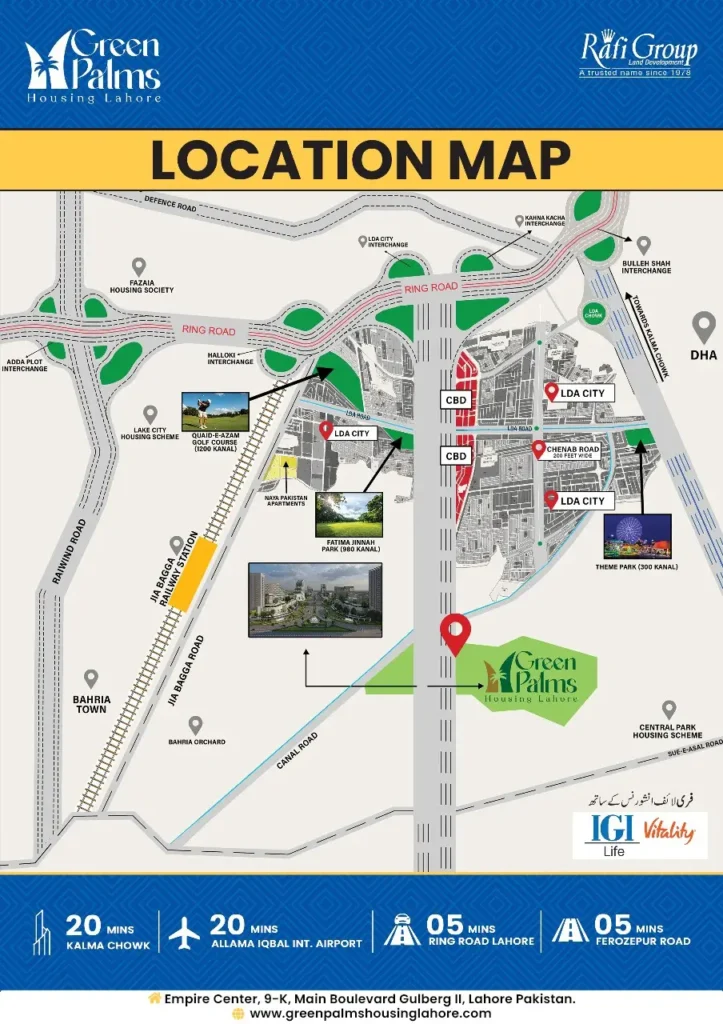Welcome to Green Palms Housing Lahore, an LDA Approved residential and commercial project by Rafi Group, a trusted name in real estate since 1978. Ideally located on the 300 Feet Wide Jehlum Road (LDA Structure Road), the project offers affordable plots with flexible instalment plans and exceptional future growth potential. With direct connectivity to Ring Road, Chenab Road, Ferozepur Road, and the upcoming CBD 2, Green Palms is set to become one of Lahore’s most promising housing communities.